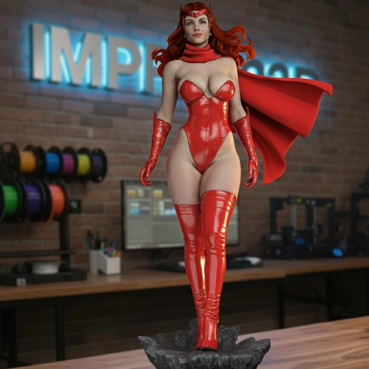 • Nível de Detalhe DE CAIR O QUEIXO: Cada linha do seu uniforme clássico vermelho, o movimento da capa esvoaçante e a expressão poderosa da Feiticeira Escarlate estão cravados na resina. Esta é uma Escultura 3D com precisão cirúrgica, focada tanto na imponência do corpo inteiro quanto nos detalhes expressivos do close-up.
