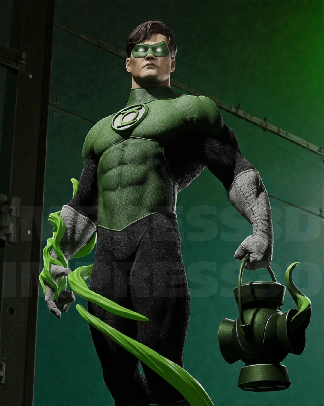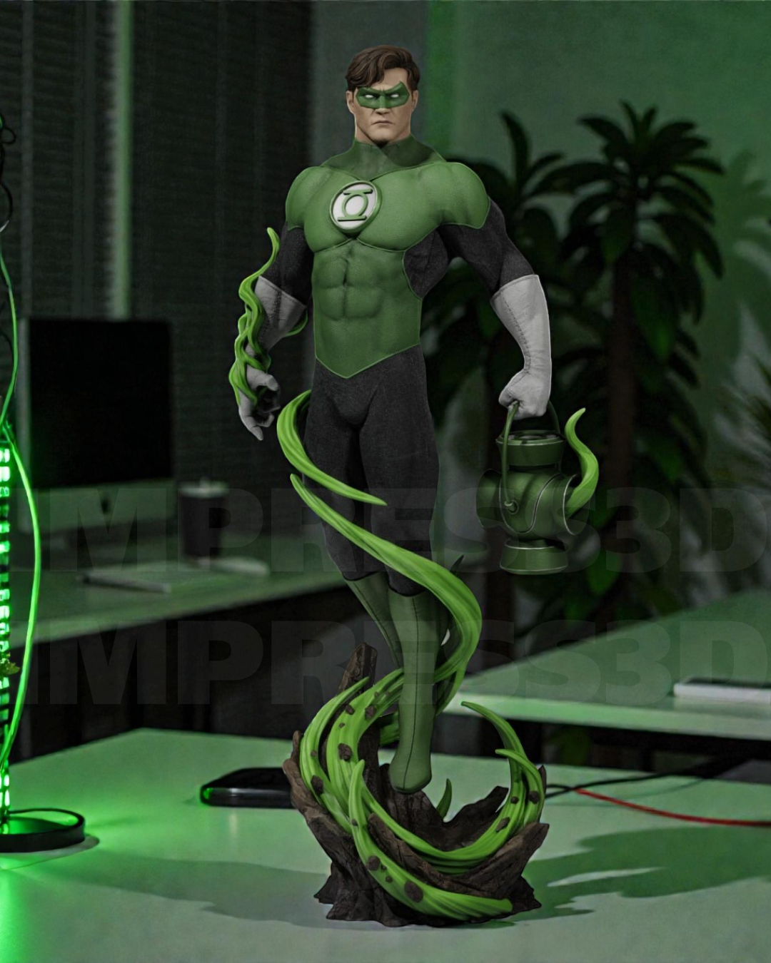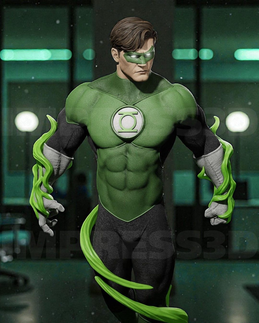 Hal Jordan. O humano escolhido pelo anel mais poderoso do universo. Essa figura traz o Lanterna Verde em toda a sua imponência — uniforme clássico verde e preto, a lanterna na mão e as energias do anel tomando conta da base, criando uma composição que chama atenção de qualquer ângulo.