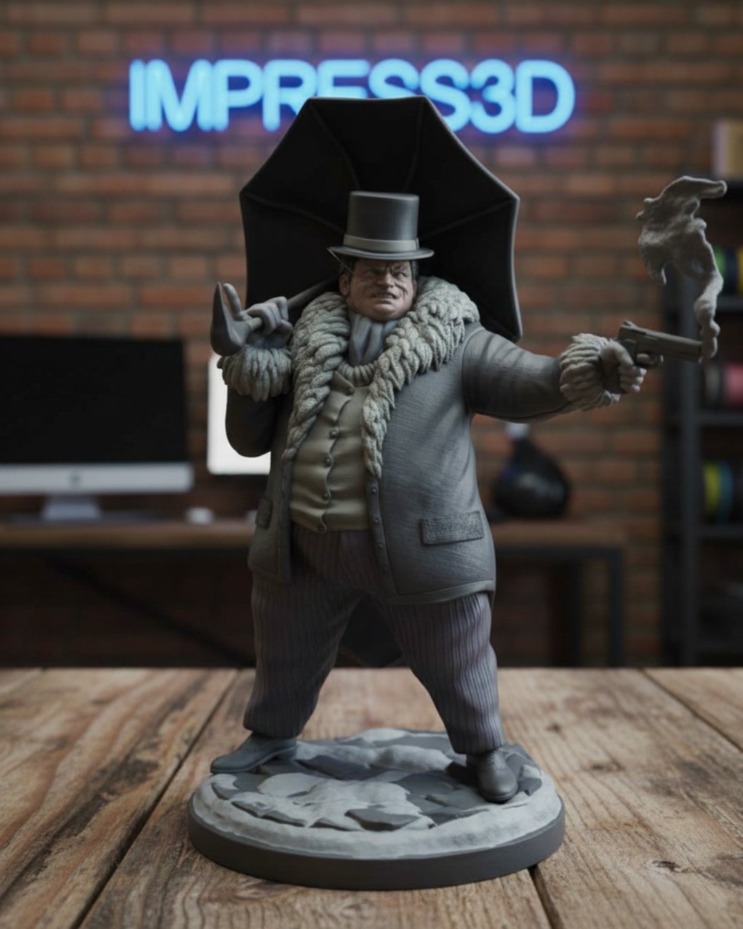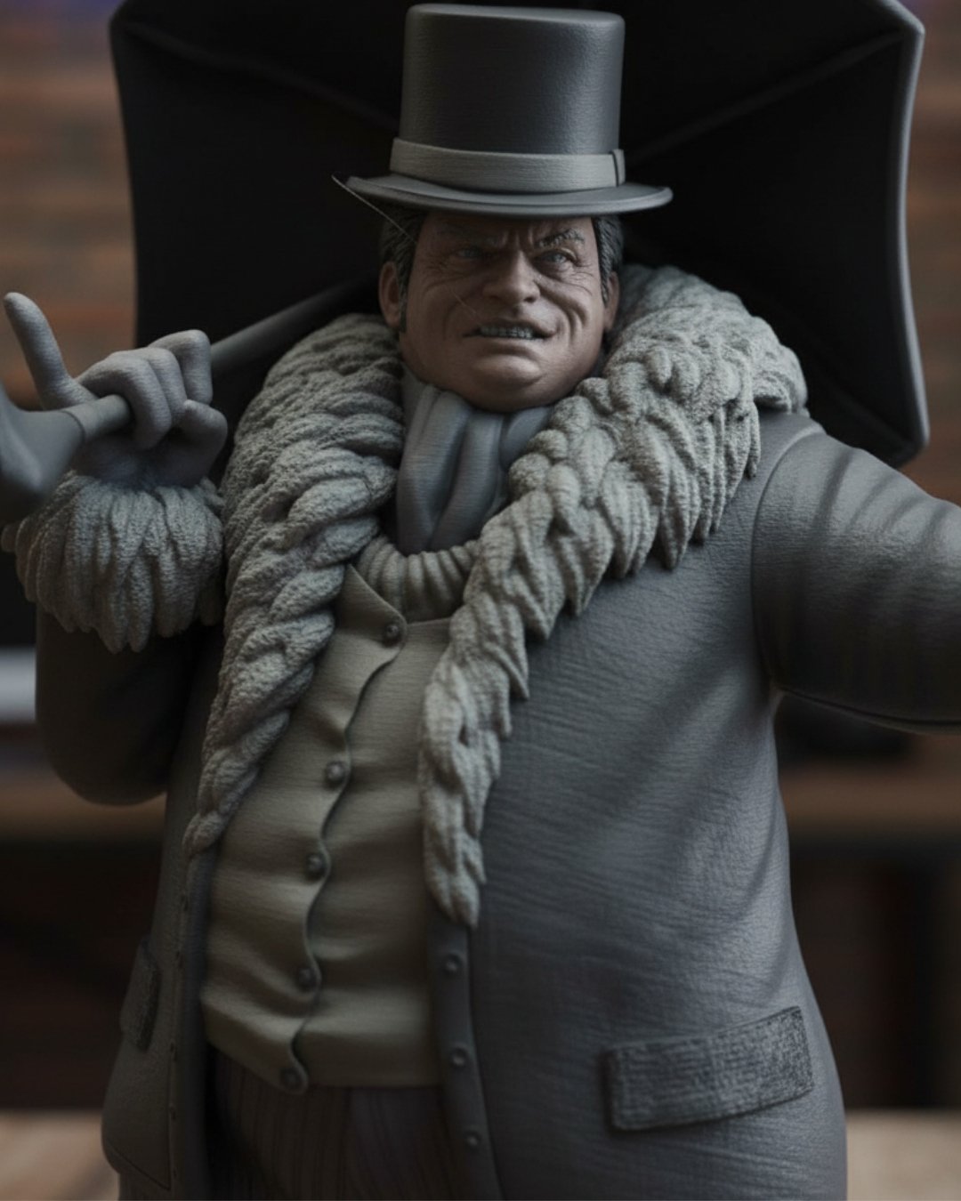 Se liga nessa estátua do Pinguim! Não é só mais uma figurinha, mas sim O Oswald Cobblepot em pessoa, com aquela pose de quem acabou de aprontar uma em Gotham. Ele tá com o guarda-chuva maroto e o pistolão soltando fumaça. Por isso, é o tipo de peça que faz a galera parar e perguntar: “Caramba, onde você achou isso?”.